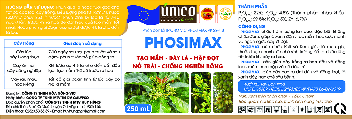 Phosimax còn chứa Kali và kẽm giúp lá mau già, thuần thục nhanh, ức chế sinh trưởng để tạo ra hiệu ứng tốt trước khi cây ra hoa.
